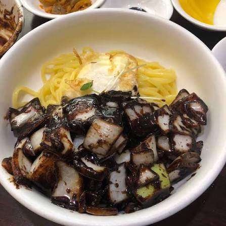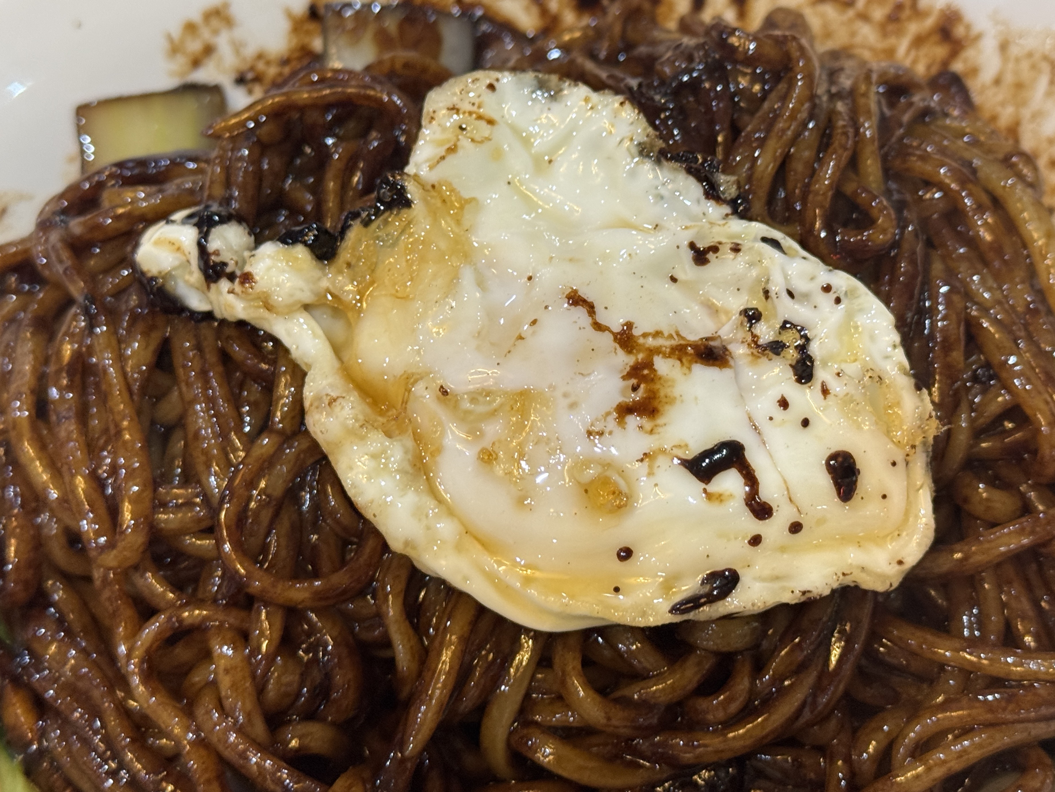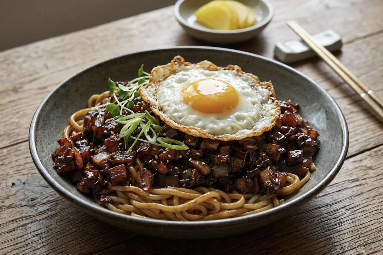 튀기듯 구운 반숙 달걀 프라이는 간짜장의 상징입니다. 노른자의 고소함이 춘장의 짠맛을 부드럽게 감싸줍니다.