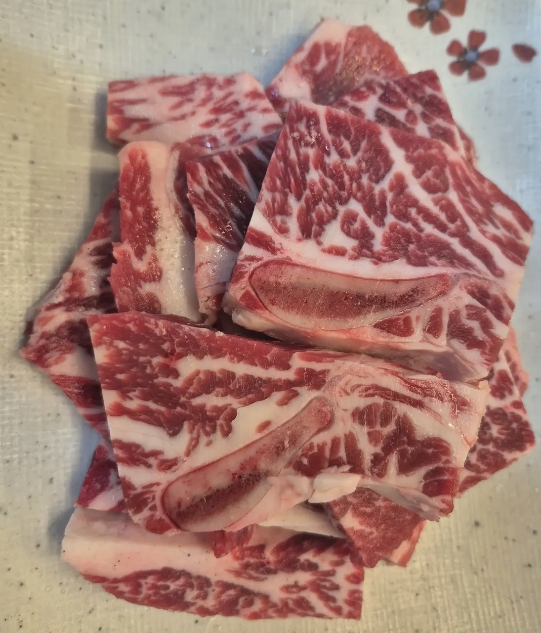 꽃갈비살은 마블링이 아름답게 퍼져 있어 육즙이 풍부하고 부드럽습니다. 본갈비살은 뼈에 붙은 살로 조금 더 쫄깃하며 고소한 풍미가 강합니다.