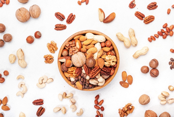 견과류는 불포화지방산, 특히 오메가-3와 오메가-9 지방산이 풍부하여 혈중 콜레스테롤 수치를 낮추고 혈관을 유연하게 만들어 심근경색, 뇌졸중 등의 위험을 줄이는 데 도움을 줍니다.