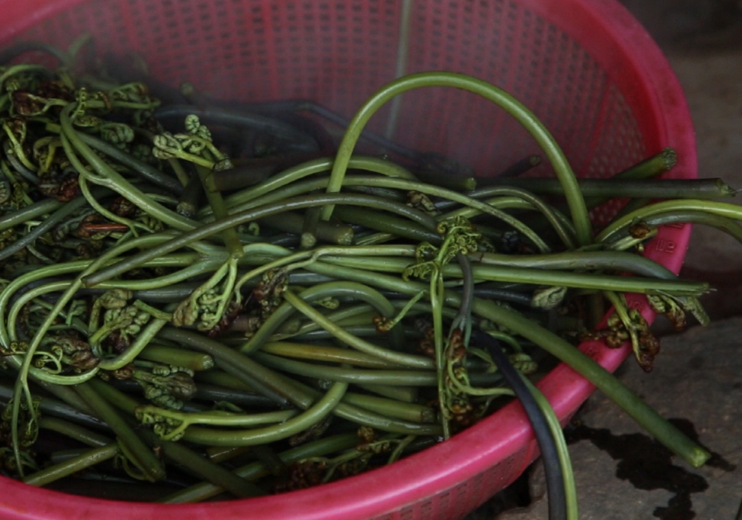 막 채취한 상태의 고사리로, 부드러운 식감이 특징입니다.