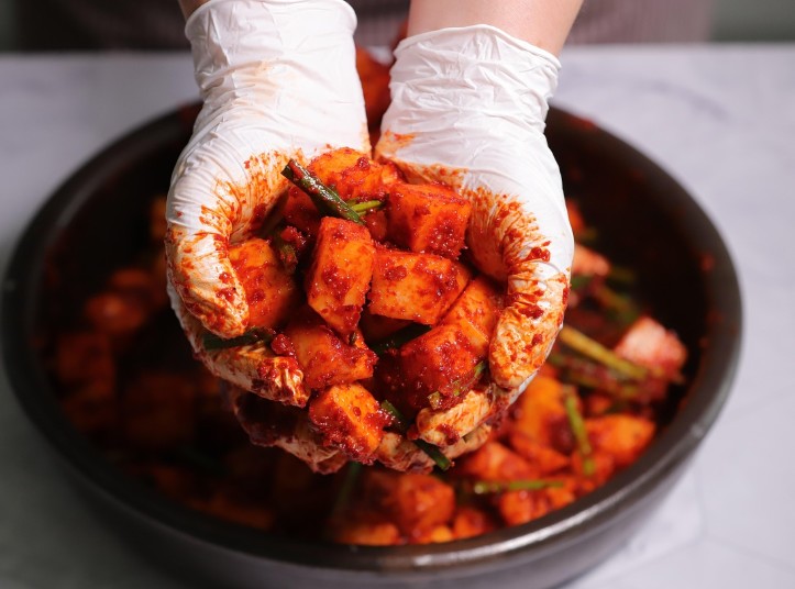 무를 큐브 형태로 썰어 양념에 버무린 김치로 아삭한 식감이 특징입니다.