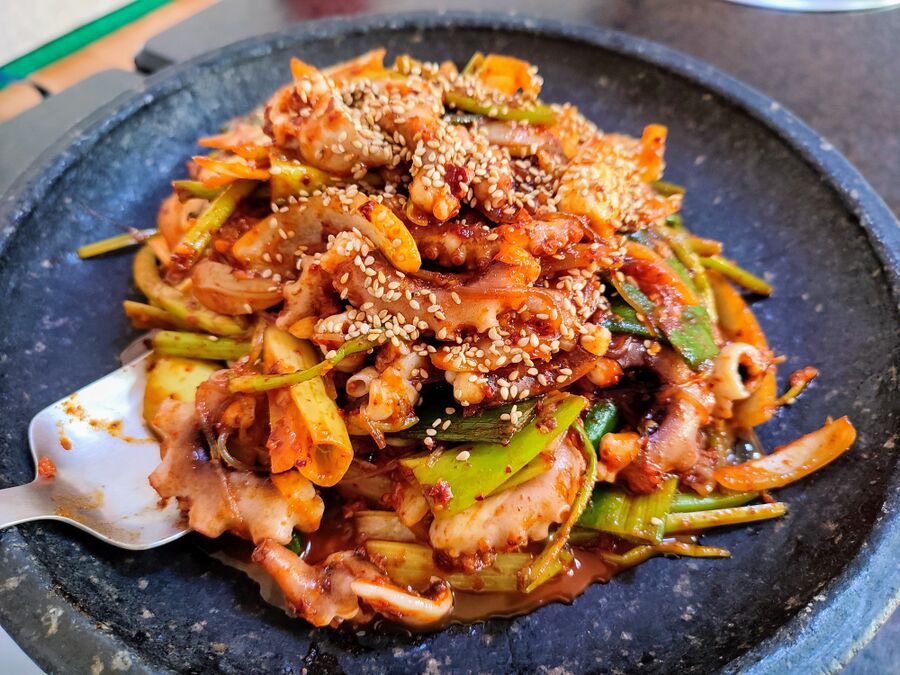 데쳐서 준비한 낙지를 넣고 1~2분 이내로 빠르게 볶아줍니다. 낙지는 이미 한번 데쳐졌기 때문에 오래 볶을 필요가 없습니다. 양념이 낙지와 채소에 고루 묻을 정도로만 볶아줍니다.