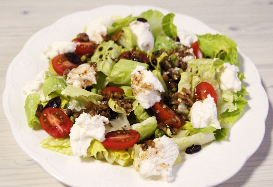 리코타 치즈 100g, 방울토마토 6~8개, 어린잎 채소 또는 로메인, 견과류, 올리브오일, 발사믹식초
