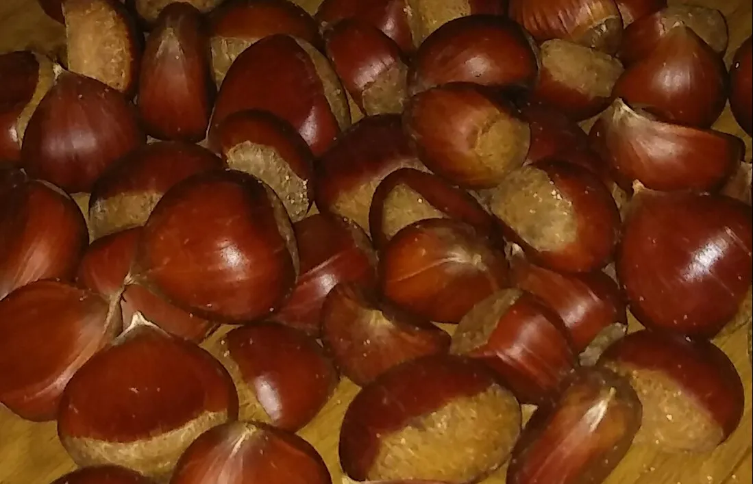 생밤을 깔 때, 밤의 둥근 밑동 부분(까만 부분)을 칼로 평평하게 잘라준 후, 칼날로 윗부분부터 돌려가며 껍질을 벗기면 좀 더 수월하게 깔 수 있습니다.