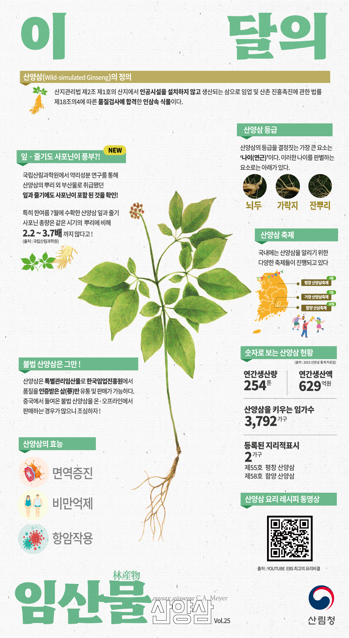 산양삼은 산에서 자라는 인삼과 유사한 특성을 가진 약초로, 자연과 가까운 환경에서 인위적인 농약이나 비료 없이 재배됩니다. 야생삼의 효능을 닮아 ‘반(半)야생삼’으로 불리며, 면역력 증진과 피로 회복 등에 효과가 높아 귀한 약초로 취급됩니다. 산삼에 비해 구입이 비교적 용이하며, 인삼보다 유효 사포닌 함량이 높을 수도 있어 건강식품으로 주목받고 있습니다. 일반적으로 5~10년 이상 키운 산양삼이 효능이 좋다고 알려져 있으며, 생식·다림·침출 등 다양한 방식으로 섭취됩니다. 자연친화적인 방식으로 키워진 만큼 가격은 높지만, 품질과 약효에 대한 신뢰로 인해 꾸준한 수요가 있는 건강 약초입니다. 지난 시간에는 산양삼 부작용·주의할점 / 이름 유래 / 산양삼 장뇌삼 차이 / 칼로리 / 산양삼 영양소 / 혈당지수 / 하루 권장섭취량에 대해서 알아 봤는데요. 오늘 이 시간에는 산양삼 효능 / 가격 / 수확시기 / 채취시기 / 제철 / 손질 방법 / 먹는 방법 / 보관 방법에 대해서 이야기 나누어 보겠습니다.