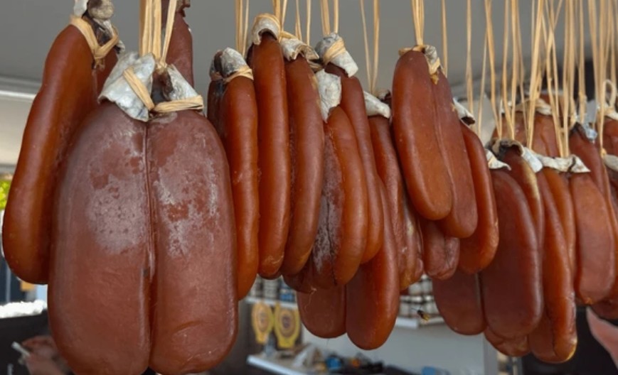 염지한 어란을 바람이 잘 통하는 곳에서 1~2주간 자연 건조시키면 형태가 단단하고 맛이 농축된 어란이 완성됩니다.