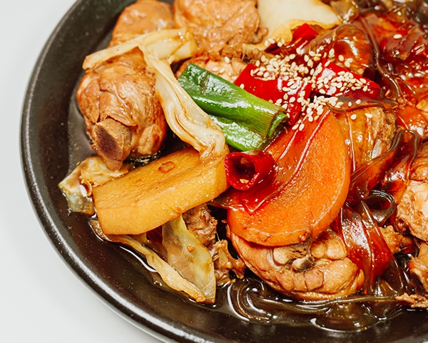 안동찜닭은 경상북도 안동의 향토 음식으로, 조선시대부터 전해 내려오는 닭 요리가 현대에 와서 발전된 형태를 띠고 있습니다. 간장 양념을 기본으로 하여 닭고기, 각종 채소, 그리고 탱글탱글한 당면을 함께 넣어 자작하게 끓여내는 음식이며, 달콤하고 짭조름한 감칠맛과 매콤함이 조화롭게 어우러져 남녀노소 모두에게 사랑받는 일품 요리입니다. 특히 푸짐한 양과 다채로운 재료의 조합은 보는 즐거움과 먹는 즐거움을 동시에 선사하며, 온 가족이 함께 나누는 잔치 음식이나 특별한 날의 별미로 손색이 없는 한국의 대표 닭 요리라 할 수 있습니다.