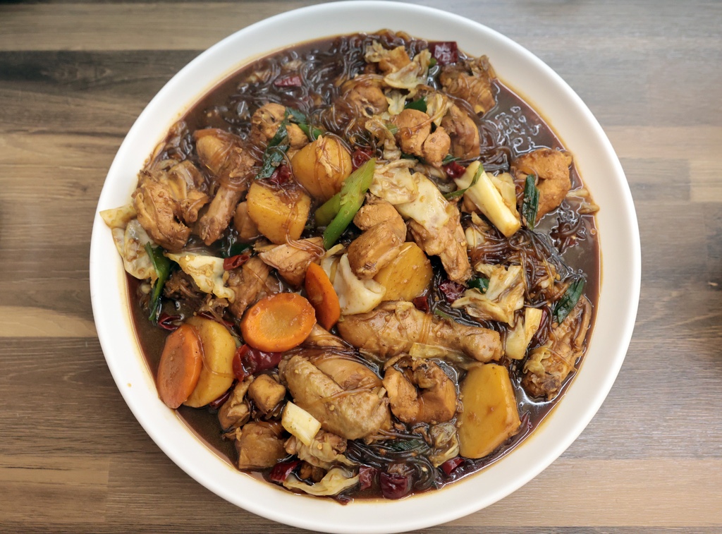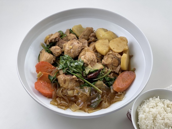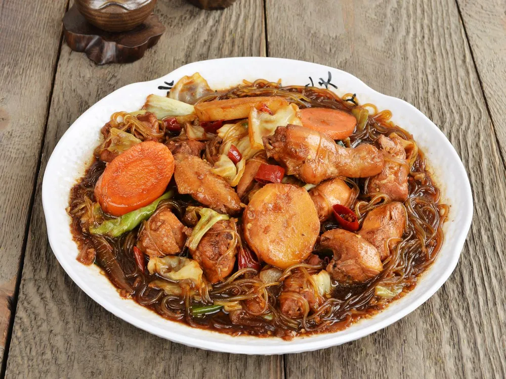 깊은 접시에 닭고기와 채소, 당면이 보기 좋게 담기도록 하여 따뜻하게 바로 상에 올립니다.