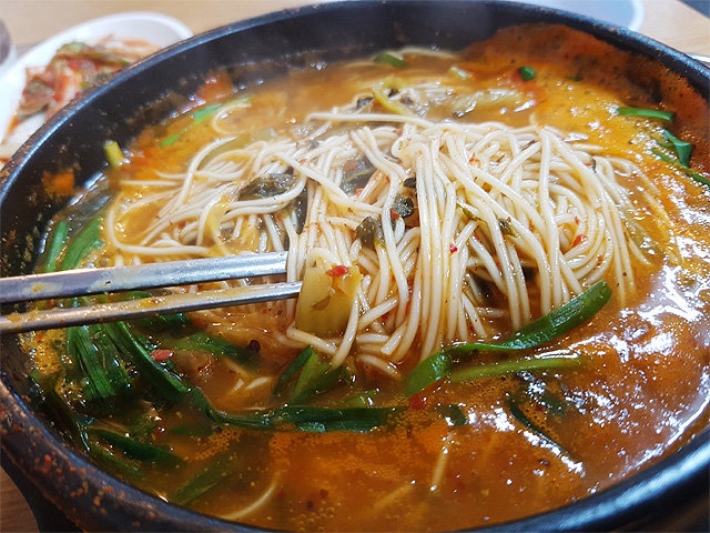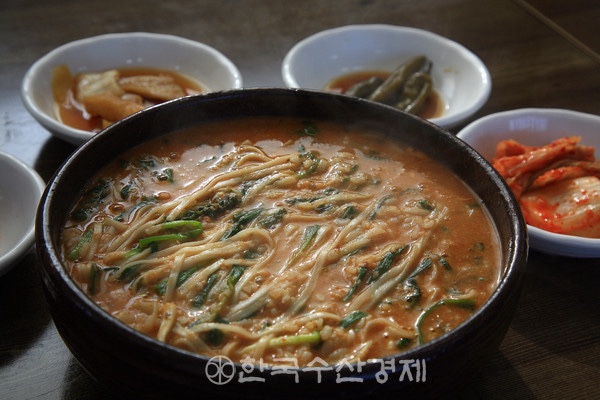 국물이 걸쭉해지면 들깨가루를 넣고 잘 섞어 고소함을 더합니다. 마지막으로 삶은 국수를 넣어 한소끔 끓이면 완성됩니다. 부추나 미나리를 올려 향긋하게 마무리합니다.
