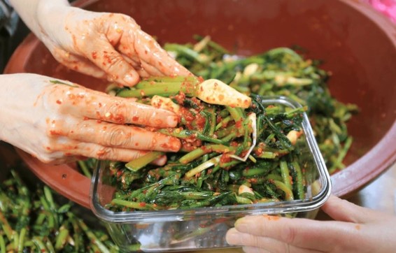 절인 열무에 준비한 양념과 밀가루풀을 넣고 골고루 버무린 후, 김치통에 담습니다.