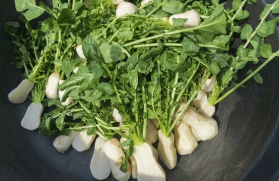 열무는 시든 잎을 제거하고, 흙이 묻은 뿌리를 칼로 긁어낸 후 흐르는 물에 깨끗이 씻습니다.