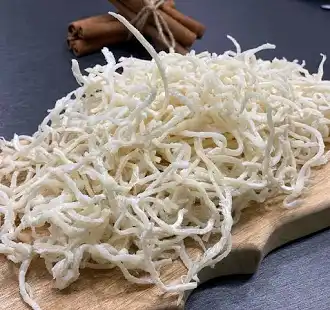 건조된 오징어를 일정한 굵기로 길게 찢어줍니다. 이 과정을 통해 쫄깃한 질감과 채 모양이 완성됩니다.