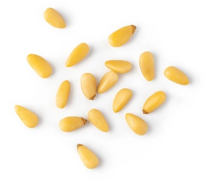 껍질을 벗긴 하얀 잣으로, 대부분의 요리에 사용되는 기본형입니다. 고소한 맛이 강하고 보관이 쉬워 가장 흔히 사용됩니다.