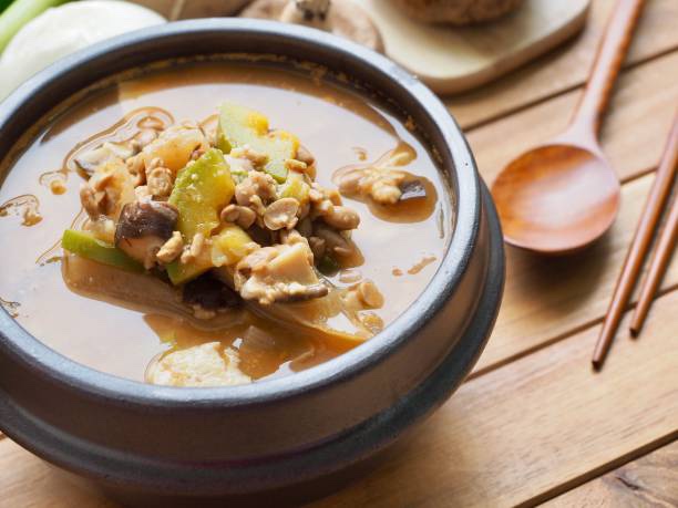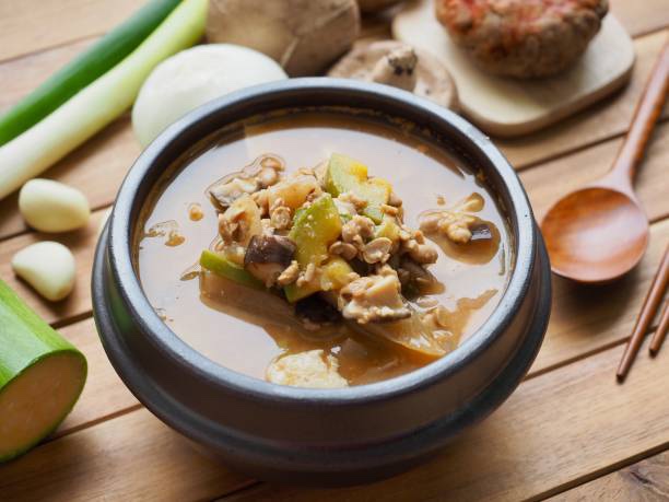 멸치 다시마 육수: 내장을 제거한 국물용 멸치와 다시마로 맑고 깔끔하게 육수를 내는 것이 청국장의 구수한 맛을 가장 잘 살려줍니다. 멸치 육수의 감칠맛은 청국장의 진한 향과 잘 어우러져 맛의 균형을 잡아줍니다.