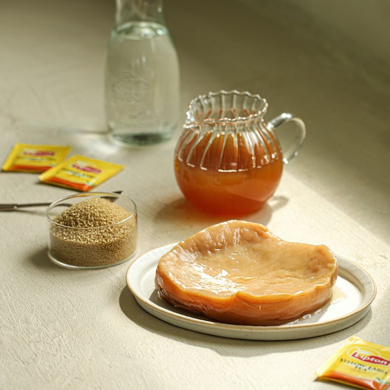또 한 가지 설로는 고대 중국의 의사 ‘콤부(Kombu)’가 한 일본 왕의 병을 낫게 하기 위해 이 발효차를 전해주었고, 그의 이름과 차(茶)가 합쳐져 Kombucha로 불리게 되었다는 이야기도 있습니다. 하지만 현대 식물학적으로 콤부는 다시마와는 전혀 관련이 없으며, 발효 과정에서 생기는 유익균과 효모로 구성된 스코비에서 그 정체가 비롯됩니다.