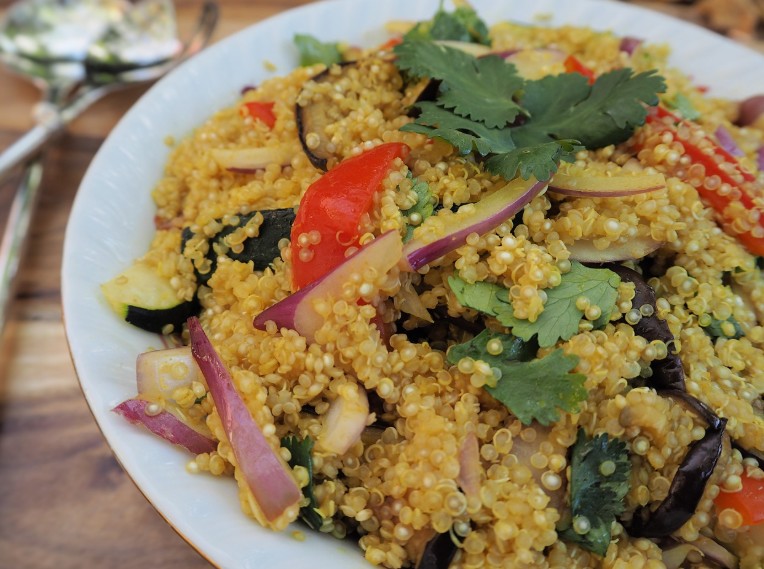 삶은 퀴노아를 채소, 견과류, 드레싱과 함께 섞으면 영양 가득한 한 끼가 됩니다.